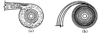 給礦口的大小對處理能力、分離粒度以及分級效率均有一定影響。其直徑常與旋流器直徑呈一定比例,大多dc=(0.08~0.25)D。給礦口的橫斷面形狀以矩形為好。而縱斷面常為圖3-4-19(a)所示的切線形。由于這種進料方式易使礦漿在進入旋流器時與器壁沖擊產(chǎn)生局部旋渦影響分級效率。因此出現(xiàn)了如圖3-4-19(b)的漸開線形及其他型式的給礦管。