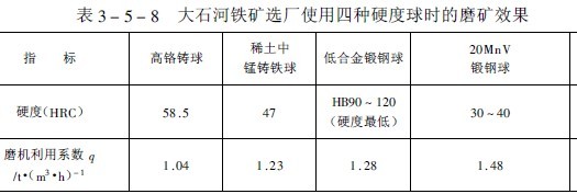 A.B.基爾波申(KH)在研究鋼球硬度對磨礦指標的影響時指出,實驗室試驗證明,鋼球對各種類型的礦石都存在一個更佳硬度的問題。按此說法,各種礦石的硬度更好值均不相同。這個說法是有道理的,值得進一步研究。我國首鋼大石河鐵礦的生產應用有力說明這個問題。大石河鐵礦1981~1983年使用了+ 種不同硬度的鋼球,各種球磨礦時的磨機利用系數如表3-5-8所示。