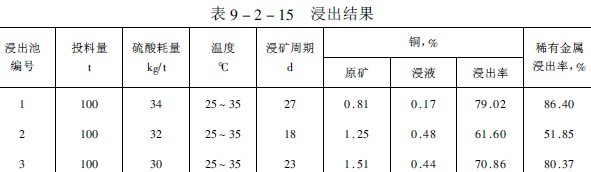 由于尾砂粒度細、難滲濾,故采用浸出池進行生產,先加酸化水中和礦石中的堿性脈石,待溶液pH值達2.0左右時,加入含菌高鐵(Fe sup 2+ /sup )的浸礦劑或浸出貧液(指含銅和稀有金屬降低,Fe sup 2+ /sup 較高的浸出液)進行循環浸出,直至浸出液銅、稀有金屬較低為止。然后,加銅稀有金屬含量較低的細菌高鐵液,當浸出液濃度更低時,再用水洗兩三天排料。尾砂浸出時間為二十天,浸出結果列于表9-2-15。