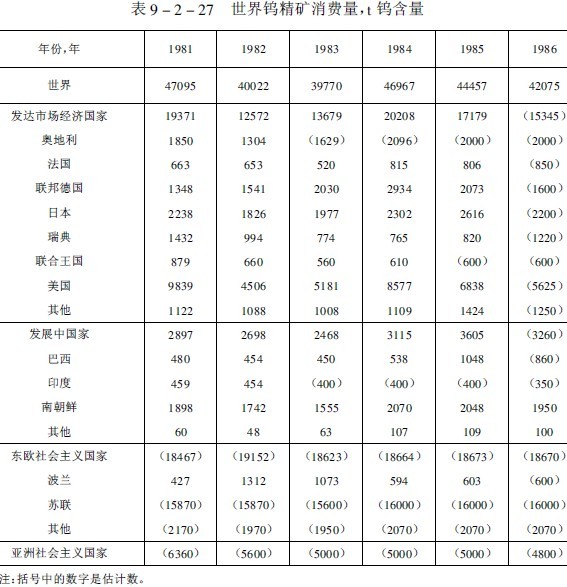 根據聯合國貿易和發展會議商品委員會鎢委會1986年11月第18屆會議報告資料,近幾年世界鎢精礦的產量和消費量分別列于表9-2-26及表9-2-27。