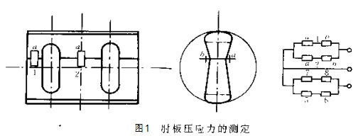為了測定肘板的壓應力,在肘板的較小截面處布置2~3組測點,如下圖1所示。每組中的a、b兩枚電阻片串聯,以測定壓應力并消除彎曲應力,各組并接以求出該截面應力的平均值,并與數量級接線方式相同的溫度補償片組成半橋。