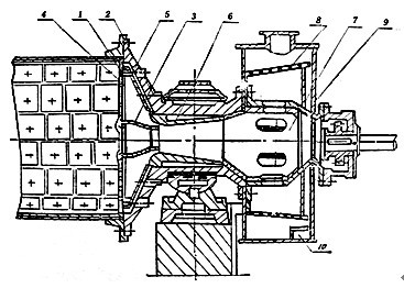 1、如圖1所示的中心傳動中心卸料端。它的卸料篦子1用螺栓5與磨頭2連結在一起,在卸料篦子與磨頭之間有葉板4,在葉板中間裝有卸料錐3,物料由卸料篦子1的孔排出后,被葉板4帶起,當物料被帶到上部時,便由葉板上滑下,經卸料錐3滑到軸頸內的截頭漏斗6內,后從中間接管7上的橢圓孔落到控制篩8上,篩8用螺釘固定到中間接管7的法蘭盤上,隨法蘭盤旋轉。9為卸料罩子,物料成品由罩子底部卸出,落入運輸機中,沒有通過篩子的粗粒物料,沿篩子滑下來從孔10卸出。