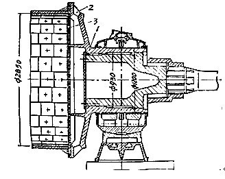 2、圖2是一種中心傳動邊緣卸料的裝置。在球磨機端蓋內表面和卸料篦板3之間,形成一個環行空間,在端蓋壁上等距切割橢圓形孔2,物料從此孔卸出,落到外罩下部(圖中外罩未畫出)。