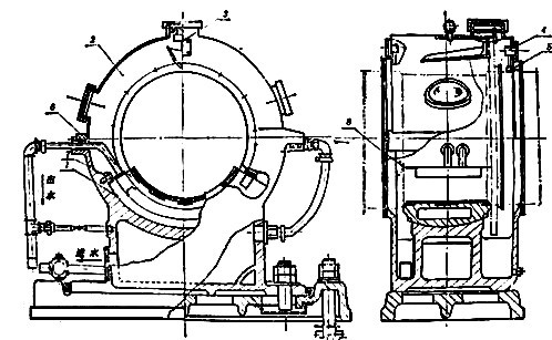 當中空軸回轉時,在環行槽內充滿了潤滑油則同樣起密封作用,潤滑油沿著油管9進入軸承,油管一端封閉,下部壁上分布許多小孔,潤滑油通過這些小孔,沿著回轉中空軸均勻分布,用過的油,由軸瓦下部接管12和與其相連的集油管而流入循環油系統的過濾裝置。